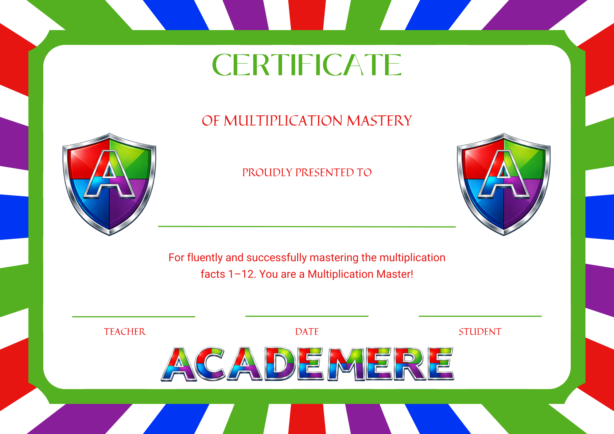 This certificate recognizes students for successfully mastering multiplication facts at the White Level. Their hard work, practice, and commitment to building strong math skills are celebrated and acknowledged by ACADEMERE.